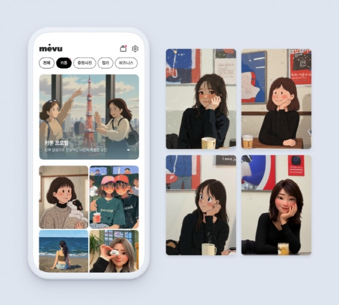 기존에 미브에서 제공했던 서비스는 이력서나 사원증 등 실용적인 목적에 맞췄다. 반면, 카툰 프로필은 SNS, 팬카페, 커뮤니티 등 감성적이고 캐주얼한 온라인 공간에서 활용할 수 있는 스타일을 제공한다.