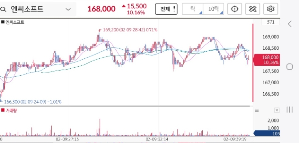 이미지 확대보기코스피에 상장된 게임주 엔씨소프트의 주가가 6월 2일 개장 직후 10% 이상의 상승세를 보였다.