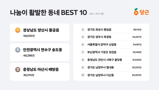 지난해 6월부터 2025년 5월까지를 기준으로 △경남 양산시 물금읍이 가장 많은 나눔 게시글이 올라오는 동네로 꼽혔다. 3년 연속 기록이다.