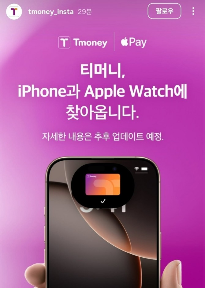 이미지 확대보기티머니는 16일 홈페이지와 SNS를 통해 "티머니, 아이폰과 애플워치에 찾아옵니다"라고 밝혔다. 이는 2023년 3월, 현대카드가 애플페이 서비스를 최초로 국내에 도입한 지 2년 만의 대중교통 결제다.