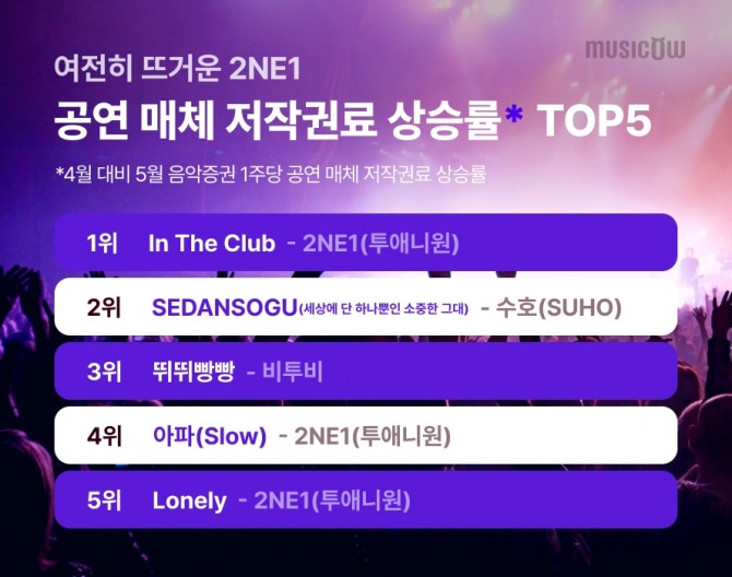 이미지 확대보기뮤직카우가 공개한 ‘2025년 5월 정산노트’ 공연 매체 저작권료 상승률 톱5를 살펴보면, 지난 4월까지 월드투어를 진행하며 활발한 무대 활동을 펼친 걸그룹 2NE1의 ‘In The Club’이 가장 높은 순위에 이름을 올렸다.