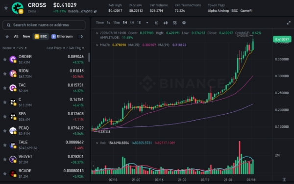 해외 대형 거래소 바이낸스에 상장된 크로쓰(CROSS)는 18일을 기준으로 거래가 0.410달러를 기록했다. 전일 대비 76% 상승한 것으로 상장 후 역대 최다 거래액을 기록했다. 크로쓰는 국내 상장사인 넥써쓰에서 운영 중인 블록체인이다.