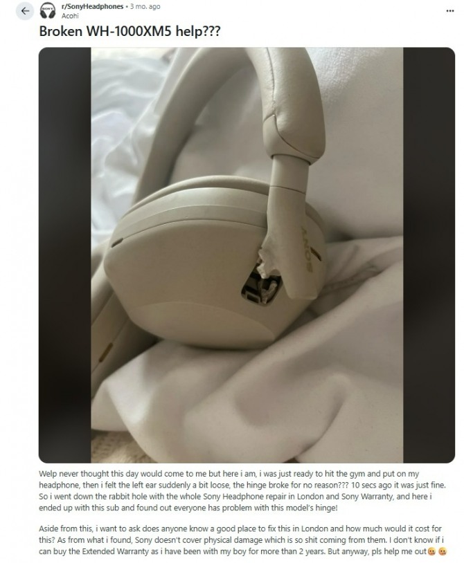 소니의 WH-1000XM6 헤드폰은 어느덧 6세대에 이른 프리미엄 액티브 노이즈캔슬링 헤드폰이다. 지속적인 품질·음질 개선으로 '무선 헤드폰', '노이즈캔슬링 헤드폰' 부문에서 항상 인기 상위를 차지하는 제품이다. 하지만 해외 온라인 커뮤니티인 레딧을 비롯해 여러 곳에서 이 힌지 파손 사례가 보고되고 있다.