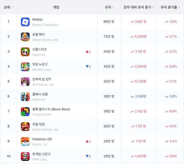같은 주 로블록스를 제외한 매출 톱5 게임들의 WAU와 전주 대비 변화율은 △1위 센추리 게임즈 'WOS: 화이트아웃 서바이벌' 12만4812명(2.56%) △2위 엔씨소프트 '리니지M' 10만4893명(-1.85%) △3위 펀플라이 '라스트 워: 서바이벌' 13만7769명(+3.03%) △5위 카카오게임즈 '오딘: 발할라 라이징' 5만2607명(-0.78%)