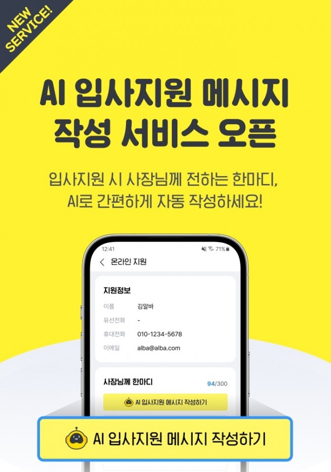알바천국 측은 "지원 메시지는 구직자의 첫인상을 결정짓는 관문이지만, 사전 정보 부족으로 작성에 어려움을 겪는 경우가 많다"며 "이번 서비스가 구직자들의 부담을 줄이고, 알바 지원 과정에서의 진입 장벽을 낮추는 데 기여할 수 있을 것으로 기대한다"고 설명했다.