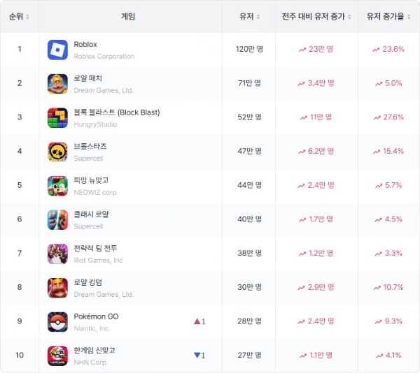 WAU 톱10 게임들이 모두 전주 대비 성장세를 보인 가운데 '포켓몬 고'가 10위에서 9위로 치고 올라왔다. 11위는 '루미큐브(26만2559명)', 12위는 '마인크래프트' 모바일판(24만2197명)이 차지했다.