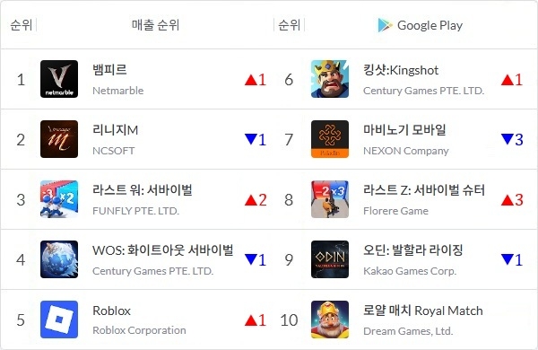 뱀피르는 지난 8월 26일 국내 출시, 9월 4일 구글 매출 1위에 오른 후 3주 연속 그 자리를 지켰다. 지난 5일 넥슨 '마비노기 모바일'이 잠시 1위에 올랐으나 이후 리니지M과 더불어 1, 2위 자리를 되찾았다.