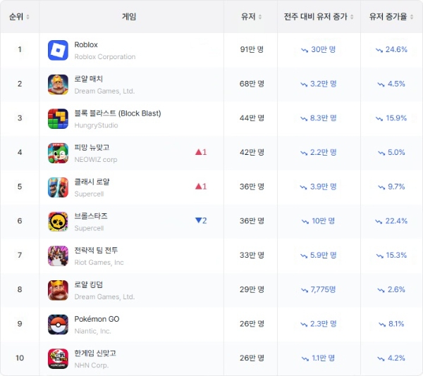 브롤스타즈 4위→6위…로블록스, 주간 매출 5위 입성