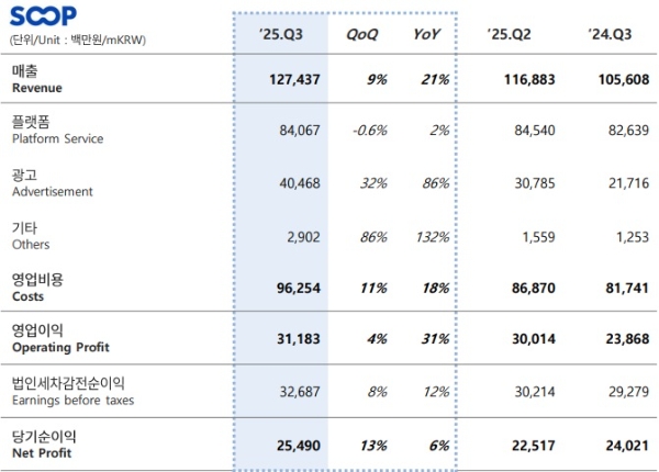 이미지 확대보기인터넷 방송 플랫폼 숲(SOOP)이 올 3분기 연결 기준 잠정 실적으로 매출 1274억 원과 영업이익 312억 원, 당기순이익 255억 원을 기록했다고 31일 밝혔다.
