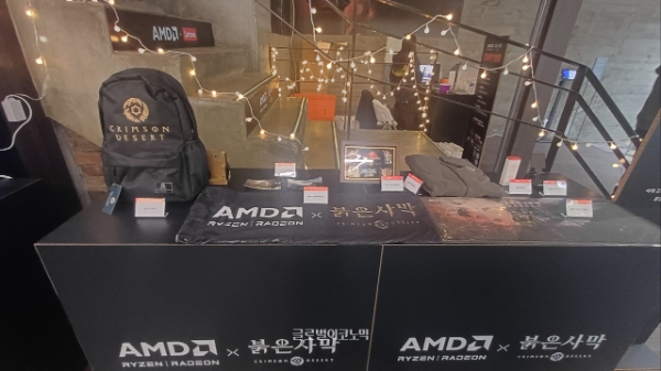 이미지 확대보기팝업스토어 1층에 전시된 AMD 제품군과 붉은사막 굿즈들. 사진=이원용 기자