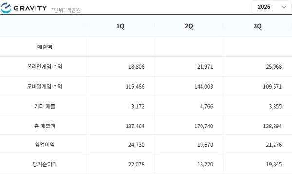 이미지 확대보기나스닥에 상장된 한국 게임사 그라비티가 올 3분기 매출 1389억 원, 영업이익 213억 원, 당기순이익 198억 원을 기록했다고 미국 시각 7일 밝혔다.