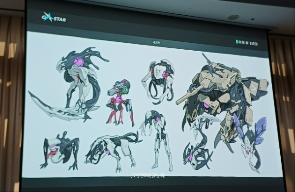 리트레일 측이 발표 중 공개한 GOG의 주요 적 '크리처' 원화. 사진=이원용 기자