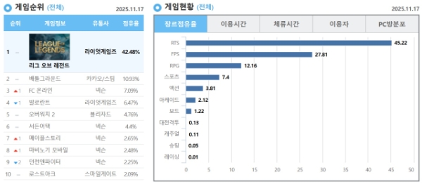 더 로그의 PC방 점유율 순위 차트에서 11월 17일 마비노기 모바일이 8위에 올랐다. 사진=더 로그 사이트 캡처