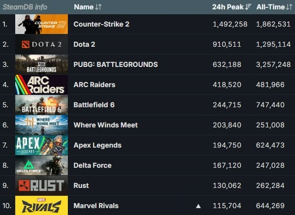 아크 레이더스 외에도 만년 1위인 스팀 운영사 밸브 코퍼레이션의 '카운터 스트라이크 2'부터 9위 페이스펀치 스튜디오 '러스트'까지 톱9의 순위 변동은 없었다.