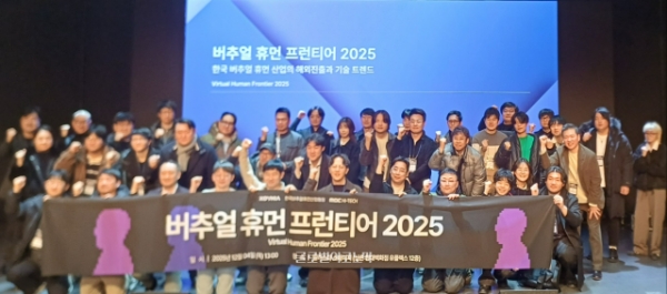 한국버추얼휴먼산업협회(KOVHIA) 2025년 연말 총회와 '버추얼 휴먼 프론티어 2025' 행사의 참석자들이 기념 촬영을 하고 있다. 사진=이원용 기자