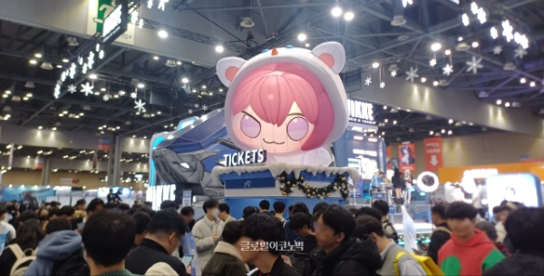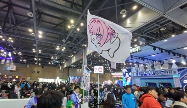 이미지 확대보기부스에서 가장 눈에 띈 것은 분홍색의 귀여운 캐릭터 '도로롱'이었다. 방문객들을 감시하는 스핑크스를 연상시키는 대형 조형물은 물론 게이머들이 자발적으로 가져온 '도로롱' 대형 깃발 또한 지나가는 이들의 눈길을 사로잡았다.