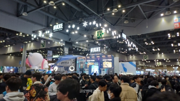 '니케'는 2023년부터 3년 연속 AGF 행사에 단독 부스가 열렸다. 올해는 '행복 동력 열차'라는 콘셉트로 전반적으로 푸른색 위주로 부스를 꾸몄다.