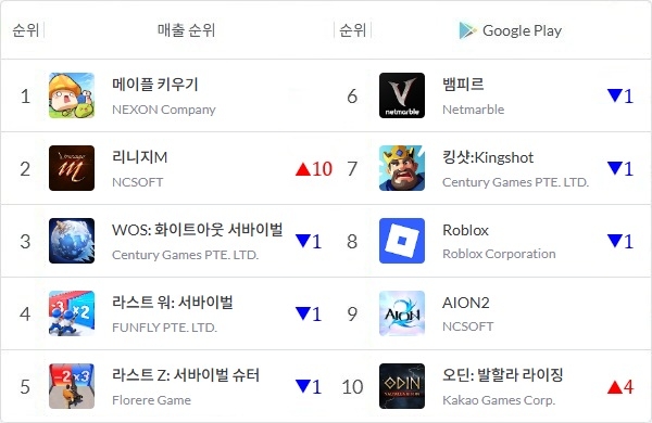 리니지M의 매출 급등으로 최상위권 게임들이 대부분 순위가 하나씩 내려간 가운데 엔씨의 신작 '아이온2'가 2주 연속 매출 9위 자리를 지켰다. 리니지M의 라이벌로 꼽히는 카카오게임즈의 '오딘: 발할라 라이징'이 매출 10위에 복귀했다.