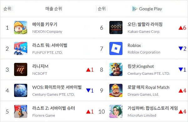 이 외에는 최상위권에 중국산 게임 5종에 미국의 '로블록스', 튀르키예 퍼즐 게임 '로얄 매치'가 오르며 외산 게임들의 매출 강세가 지속되고 있다.