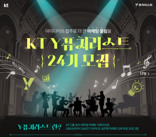 이미지 확대보기14일 KT에 따르면 Y퓨처리스트로 선발된 대학생들은 KT사업 관련 팀 프로젝트와 Y브랜드 마케팅에 직접 참여하며 실무 역량을 기를 수 있다. 기본기 강화를 위한 제안서 작성, 콘텐츠 기획을 주제로 한 크리에이티브 클래스와 스터디 지원, 멤버 간 유대감 강화를 위한 각종 프로그램을 수행한다.