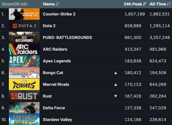 이미지 확대보기아크 레이더스 위로 스팀 운영사 밸브 코퍼레이션의 '카운터 스트라이크 2'와 '도타 2', 한국 크래프톤의 '펍지: 배틀그라운드'와 5위인 일렉트로닉 아츠(EA) '에이펙스 레전드'까지 톱5 간 순위 변동은 없었다.