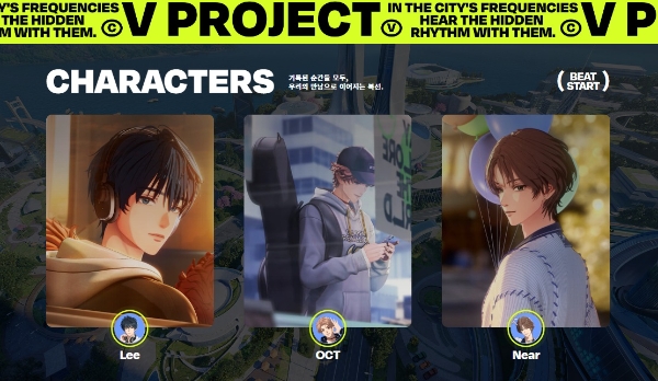 V 프로젝트 티저 사이트에는 게임의 주인공인 '리(Lee)'와 '니어(Near)' 'OCT'의 모습을 확인할 수 있다. 이들의 화풍은 3D 카툰 렌더링으로 버추얼 보이그룹 '플레이브'나 인기 애니메이션 '케이팝 데몬 헌터스' 등을 떠올리게 한다.