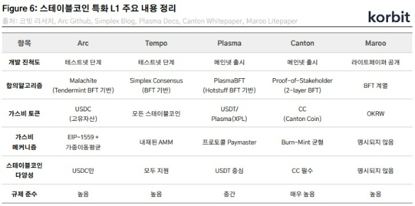 '스테이블코인 특화 레이어1(L1)의 부상' 보고서에 쓰인 표. 5개 스테이블코인 레이어1의 특징을 비교 분석했다. 사진=코빗리서치센터이미지 확대보기