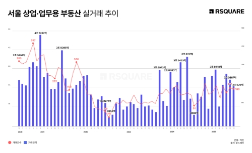 이미지 확대보기6일 알스퀘어에 따르면 지난해 12월 서울 상업·업무용 건물 거래규모는 2조 520억 원, 거래건수는 169건으로 전월과 비교하면 거래규모는 13.3%, 거래건수는 4.5% 감소하며 다소 감소했다.