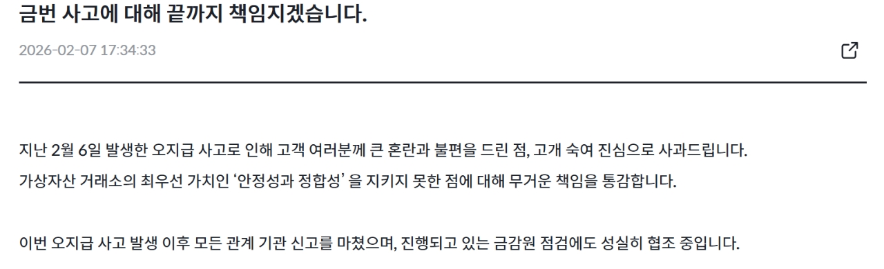 앞서 빗썸은 전날 '랜덤박스' 이벤트로 참여 이용자에게 당첨금을 지급하려다 직원의 실수로 '원' 단위를 '비트코인'으로 잘못 입력했다. 이에 애초 249명에게 지급되려던 총 62만원이 62만개의 비트코인으로 오지급 됐다.