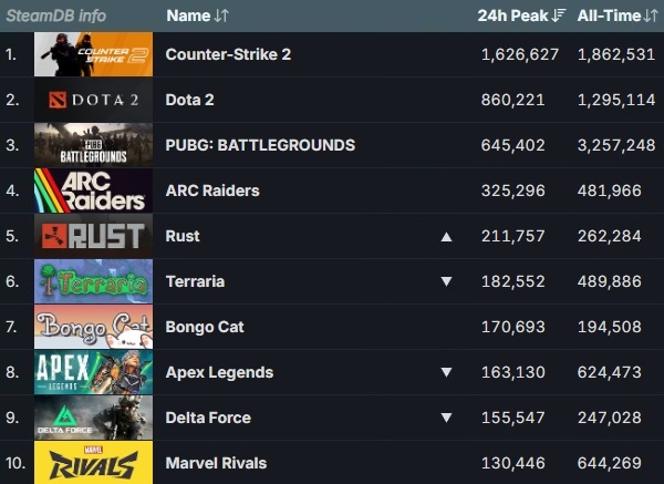 '배틀그라운드'와 아크 레이더스 외 한국 게임의 순위를 살펴보면 프로젝트문 '림버스 컴퍼니(3만2840명)'가 66위, 펄어비스 '검은사막(2만4135명)'이 91위, 엠바크 스튜디오 '더 파이널스(2만230명)'이 105위 등을 기록했다.