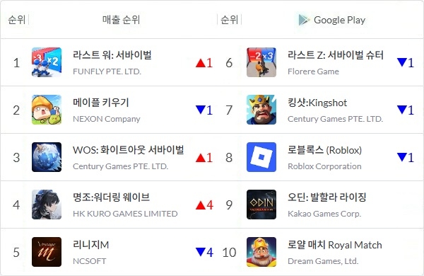 아이지에이웍스 앱 통계 분석 플랫폼 모바일인덱스에 따르면 '라스트 워'는 12일 오후 9시 30분 경 국내 구글 매출 1위에 올랐다. 이로 인해 넥슨 '메이플 키우기'는 지난해 11월 6일 출시 후 13주 동안 지켜오던 매출 1위 자리를 내주었다.