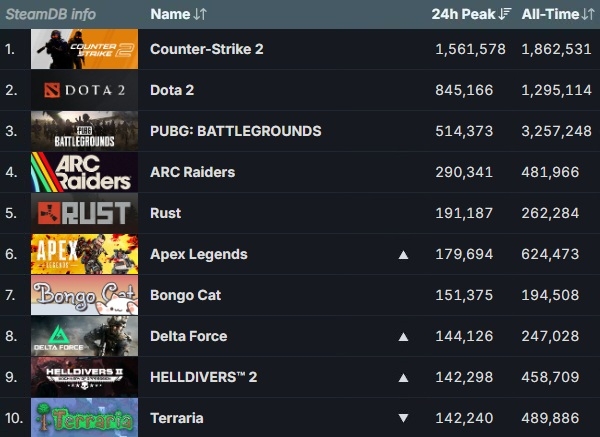 '카운터 스트라이크 2'와 '도타 2', '펍지: 배틀그라운드' 등이 부동의 톱3로 자리잡은 가운데 넥슨 산하 엠바크 스튜디오의 '아크 레이더스' 또한 15주 연속 동시 접속 4위 자리를 지켰다.