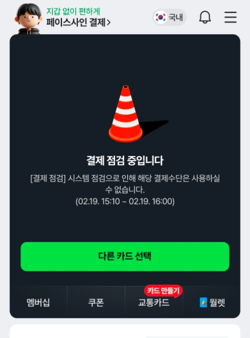 현재 외부 결제 시스템 중 일부는 복구된 것으로 확인됐다. 다만 네이버페이를 통한 현장 결제는 아직 어려운 것으로 확인됐다. 네이버페이를 실행해보면 오후 4시까지 점검한다고 공지했다.