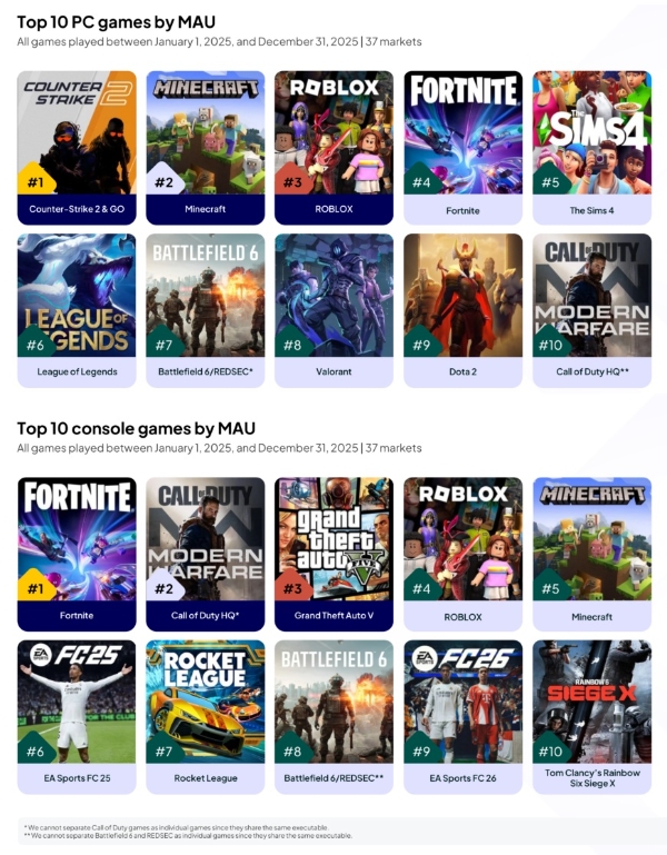 게임 이용자 지표를 살펴보면 신작보다는 기존작들의 강세가 이어졌다. 뉴주에 따르면 2025년 기준 글로벌 PC 플랫폼의 연 평균 월간 활성 이용자 수(MAU) 톱5 게임은 '카운터 스트라이크'와 '마인크래프트', '로블록스', '포트나이트', '더 심즈 4' 등 순이었다. 한국의 국민 게임으로 꼽히는 '리그 오브 레전드(LOL)'는 6위에 자리 잡았다.