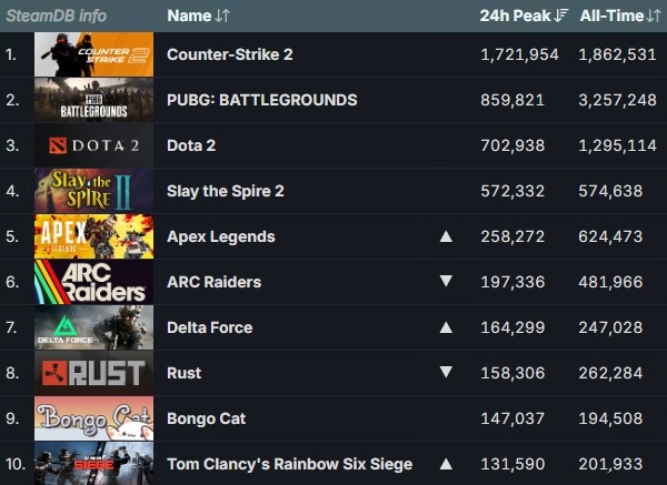 미국의 인디 카드 전략 게임 '슬더스 2'가 주말 기준 2주 연속으로 57만 명의 동시 접속자를 기록하며 4위 자리를 지킨 가운데 넥슨의 '아크 레이더스'가 EA '에이펙스 레전드'에 밀려 5위에서 6위로 자리를 옮겼다.