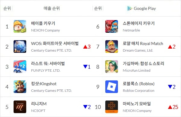 넥슨의 또 다른 게임 '메이플 키우기'가 2주 연속 매출 1위를 지킨 가운데. 엔씨소프트 '리니지M'과 넷마블 '스톤에이지 키우기' 등도 최상위권에 머물렀다.