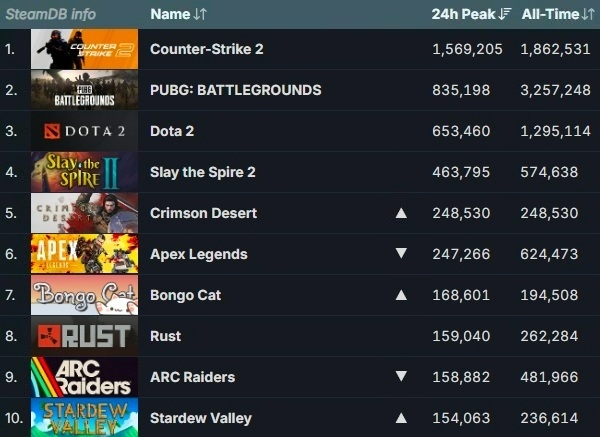 밸브 코퍼레이션의 '카운터 스트라이크 2'와 '도타 2', 크래프톤 '펍지: 배틀그라운드', 메가크릿 '슬레이 더 스파이어 2' 등 톱4의 순위 변동이 없던 가운데 펄어비스의 '붉은사막'에 지난주보다 2만7731명(11.1%) 더 많은 27만6261명의 동시 접속자가 몰렸다.