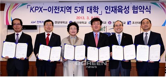 [글로벌이코노믹=김병화기자] '광주전남 혁신도시'로 이전하는 전력거래소(이사장 남호기)가 8일 인근 5개 대학과 지역인재육성 및 취업률 향상을 위한 MOU를 체결했다. 전력거래소는 오는 2014년 10월 전남 나주로 이전한다.이날 협약에 참여한 대학은 동신대학교, 목포대학교, 조선대학교, 전북대학교, 경상대학교 등 5개 대학이다.