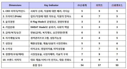 [글로벌이코노믹=노정용기자] 1991년 삼성그룹에서 계열 분리된 신세계그룹은 백화점에서 할인점, 식자재 가공‧유통, 외식업 등으로 사업영역을 확장하면서 대기업으로 성장한 전문유통기업이다. 그러나 전문유통기업인 롯데그룹과 마찬가지로 골목상권 위협의 주범으로 지목되고 있는데다가, 노조사찰‧탄압, 빵집부당지원, 오너의 국회 국정감사 불출석, 경쟁사와의 소송 등 내우외환의 위기를 경험하고 있다.20일 글로벌이코노믹와 국가정보전략연구소가 발표한 ‘위대한 직장찾기-신세계그룹 편’ 평가대상 기업의 차원별 성취도 점수에 따르면 27개 계열사 가운데 우량기업은 없지만 이마트가 57점을 획득해 우량기업으로 발돋움 하기 위한 발판을 마련한 것으로 평가됐다. 이어 ㈜신세계와 신세계푸드가 각각 54점과 50점으로 그 뒤를 이었다. 신세계그룹의 평가대상 기업 모두 우량기업에는 속하지 못하고 보통기업으로 자리매김하고 있다.