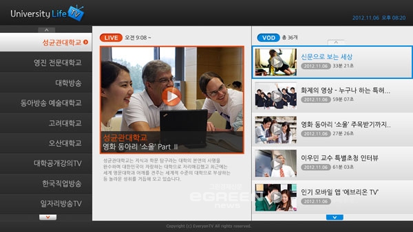 [글로벌이코노믹=노진우기자] 고려대, 성균관대 등 주요 대학교 전용 채널을 스마트TV를 통해 시청할 수 있게 된다.에브리온TV는 티브로드에서 출시한 스마트TV ‘스마트 플러스’에 HTML5로 제작된 대학 정보 TV 앱 ‘유니버시티 라이프(University Life)’를 런칭했다.