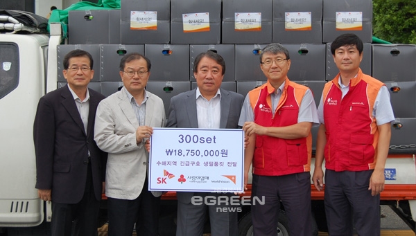 SK는 2003년부터 월드비전과 함께 매년 긴급재난 구호물품을 사전제작 해 집중호우, 태풍 피해 등 각종 재난이 발생한 현장에 신속히 전달해 왔다.