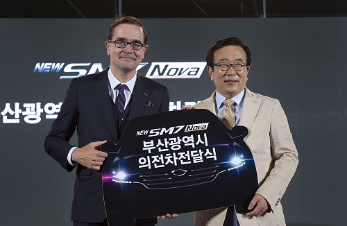 이미지 확대보기르노삼성차는 New SM7 Nova의 출시를 축하하며 지난 2년간의 힘든 시기에 많은 격려와 응원의 메시지를 보내준 부산시민들에게 감사의 마음을 전하기 위해 ‘르노삼성자동차와 부산시민의 밤’ 행사를 진행했다. 이때 르노삼성차는 부산광역시 의전차량으로 New SM7 Nova를 전달했다.