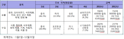 둘째, 무역수지 현황을 보면 2013년 무역흑자가 447억5000만 달러(약 45조8700억원)로 2012년 무역흑자 473억7000만 달러(약 48조5500억원) 대비 26억2000만 달러(약 2조6800억원)가 감소했다. 수출과 국가수입의 80% 이상이 석유에서 비롯되기 때문에 그 의존도 역시 매우 심화된 상태다. 최근에는 국제유가가 조금씩 떨어지고 있지만 남반구를 제외한 국가들에 겨울이 다가오면서 난방용 기름 및 가스의 수요증가와 가격변동에 따라 무역수지가 영향을 받을 것으로 보인다. 이외에 광물자원도 풍부해 다이아몬드와 금의 수출도 진행되고 있다. 수출입 주요 대상국은 중국, 미국, 포르투갈, 인도, 남아프리카공화국 등이다. 현재 교역국은 역사적으로 식민지 정책부터 내전, 군사 및 정치 지원 등에 관련이 있는 국가가 대부분이다. 특히 중국은 자금지원과 금의 수출이 주를 이루고 있어 수출입 국가 중에서 가장 높은 점유율을 차지하고 있다. 최근 아프리카의 나미비아와 양국의 산업부 장관회담을 통해 무역확대를 약속하기도 했다.