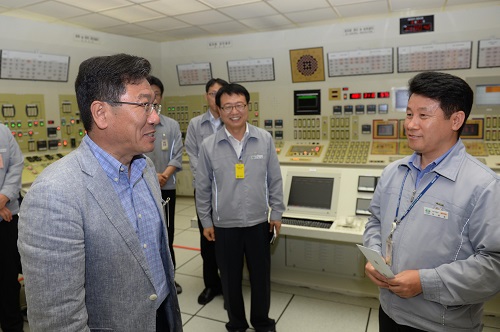 이미지 확대보기▲윤상직산업통상자원부장관이1일오후동남권원자력발전시설인경북울진한울원전본부제3발전소를방문,주제어실과사용후핵연료저장시설현장을점검하고있는모습.