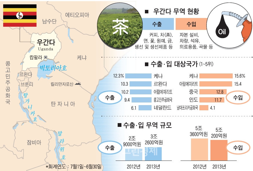 둘째, 무역수지 현황을 보면 2013년 무역적자가 17억200만 달러(약 1조7600억원)로 2012년 무역적자 23억7600만 달러(약 2조4600억원)와 대비해 6억7400만 달러(약 7000억원)가 감소했다. 정부의 농산물의 생산증가로 2013년 수출규모가 2012년 대비 3억4500만 달러(약 3600억원) 증가했다. 수출 주요상품은 커피, 차, 면화, 원예, 생선 등이다. 커피와 차는 우간다의 주력 산업이며 원예는 해외 수입원 중 부가가치 산업에 속한다. 수입의 경우 천연자원을 보유하고 있음에도 개발과 기술력을 확보하고 있지 않아 수입에 의존하고 있는 현실이다.