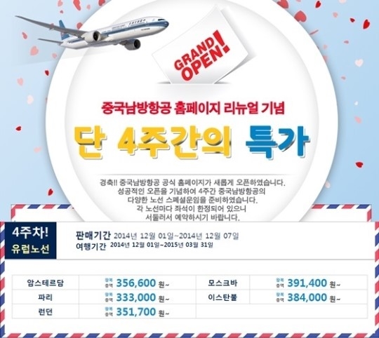 한편 이번 행사는 중국남방항공사가 홈페이지 리뉴얼을 기념의 일환으로 마련됐다. 유럽 특가 행사는 7일까지 일주일동안 선착순으로 진행되며 여행기간은 1일부터 내년 3월31일까지다.