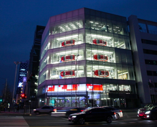 특히 건물 3층에서 5층까지 3개 층에서는 ‘카 로테이터’를 통해 신형 쏘나타가 창가의 공중에 매달려 조금씩 돌아가는 풍경을 관람할 수 있다.