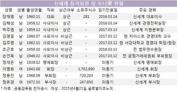 장재영 대표는 지난 2012년 12월부터 신세계 대표직을 수행하고 있으며, 김해성 경영전략실장과 박주영 지원본부장이 사내이사로 등재되어 있다.