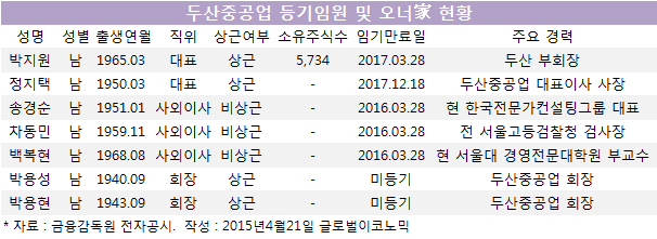 [막말파문 불똥 두산중공업] 등기임원은… 박용성 회장은 상근 미등기 회장으로 등재