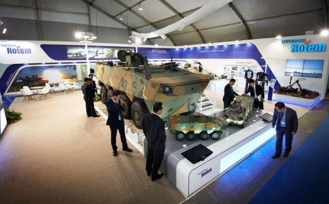 현대로템은 이번 전시회에서 한국형 차륜형장갑차사업 전략모델과 미래전투차량, 웨어러블 로봇, 지뢰탐지 로봇 등을 대거 선보인다.